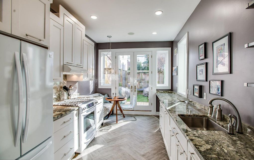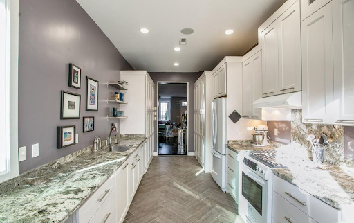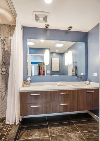 Modern galley kitchen with seating and primary bath with walk-in shower and floating vanity.